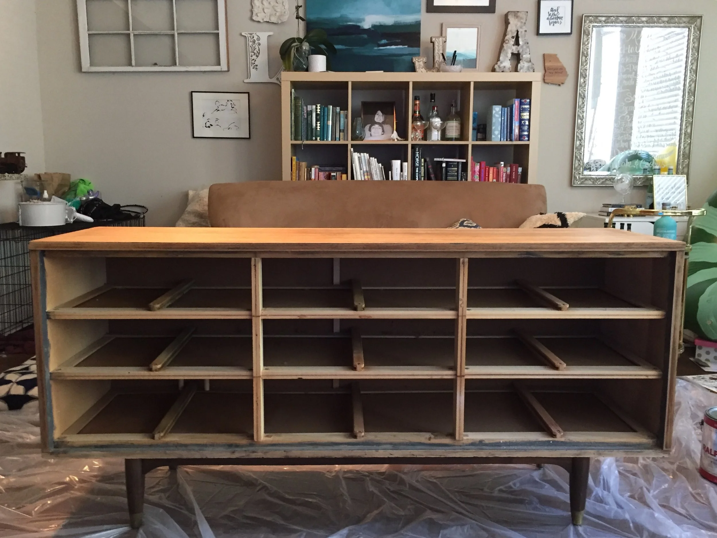 we chose to strip off the wax and paint Charolette had done (sorry!) and were going to stain it. we went into The Home Depot for stain and walked out with a beautiful blue paint instead. funny how that happened. and did you know, you CAN strip paint or stain with a stripping chemical inside an apartment. and yes, this bad boy did take up our entire living room.